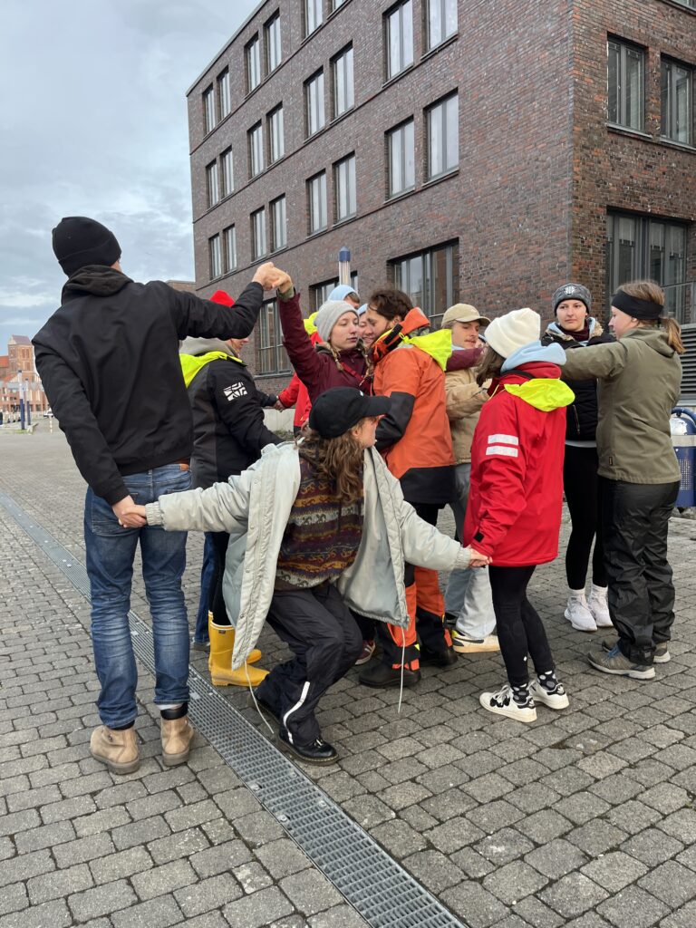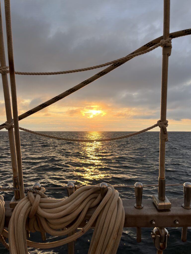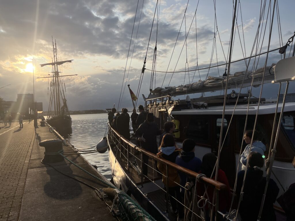 Ganz nach dem diesjährigen Törnmotto „Es schifft wieder“ hat das Wetter mitgespielt und es gab immer mal wieder kleinere Schauer. Umso schöner war der Sonnenuntergang in den wir hineingesegelt sind. Auch die Nacht wurde komplett durchgesegelt und war für alle eine spannende Erfahrung. Sonntag Mittag hieß es dann leider schon wieder: Rückfahrt, denn Sturmböen haben sich angekündigt. Wir haben die Zeit genutzt für eine Klettereinheit in den Mast – eine ganz neue Perspektive! Pünktlich zum Festmachen hat es natürlich noch einmal aus Eimern gegossen, aber das hat der Stimmung nichts angetan. So waren wir nachmittags wieder in Wismar fest und haben den freien Abend genutzt, um an Land diverse lustige Gruppenspiele zu unternehmen. Am Montag hieß es dann leider für alle aufräumen, sauber machen, Sachen packen und sich verabschieden.
