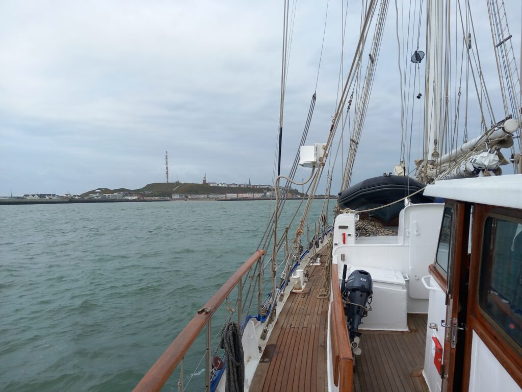 Ab Dienstagmorgen, 07. Oktober 2025, trafen die meisten Mitseglerinnen und Mitsegler der Überführungscrew an Bord in Kiel ein. Letzte Vorbereitungen wurden getroffen und eine zusätzliche Rettungsinsel, organisiert durch unseren Kapitän Norbert, wurde zum späteren Üben auf dem Vorschiff verzurrt. Am Mittwoch verließen wir nach kurzer Sicherheitseinweisung die Gebrüder-Friedrich-Werft und fuhren über Nacht durch den NOK. Am frühen Donnerstagmorgen, dem 09. Oktober, ankerten wir auf der Südreede vor Brunsbüttel und warteten fünf Stunden auf das auflaufende Hochwasser, damit wir um 13:30 Uhr am Fähranleger von Cuxhaven für wenige Minuten anlegen konnten. Dort stiegen die OceanCollege(OC)-Lehrer, zwei Watchleader und der Medic zu uns. Außerdem musste das gesamte Material von OC auf die Schnelle an Bord gebracht und verstaut werden. Nach 50 Minuten liefen wir unter Maschine wieder aus und fuhren gegen den Wind elbabwärts. Kurz vor Mitternacht wurde auf Helgoland Reede geankert.