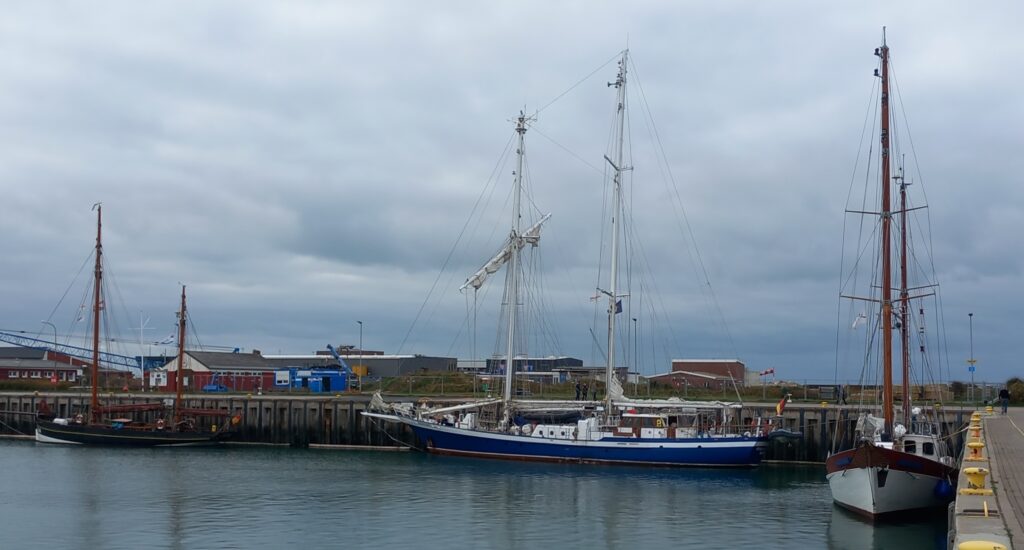 Am nächsten Morgen verholten wir zum zollfreien Tanken in den Binnenhafen. Mit vollen Dieseltanks motorten wir später in den Südhafen und blieben über Nacht dort. Am Samstagmorgen liefen wir aus und ankerten erneut auf der Helgoländer Reede. Dort wurde das Segelsetzen geübt. Am Sonntag, 12. Oktober, gingen wir Anker auf, verließen Helgoland durch die Norddurchfahrt und segelten nördlich des Tiefwasserwegs gen Westen. Am späten Montagabend, 13. Oktober, befanden wir uns auf SSW-Kurs nördlich der Insel Texel/NL. Am nächsten Tag segelten wir mit raumen und später achterlichem Wind weiter in Richtung SSW. Abends standen wir westlich von Ijmuiden/NL. Nach dem Segelbergen am Mittwoch, 15. Oktober, kreuzten wir unter Maschine das Verkehrs-trennungsgebiet und liefen um 13:50 Uhr in den Hafen von Scheveningen/NL ein.